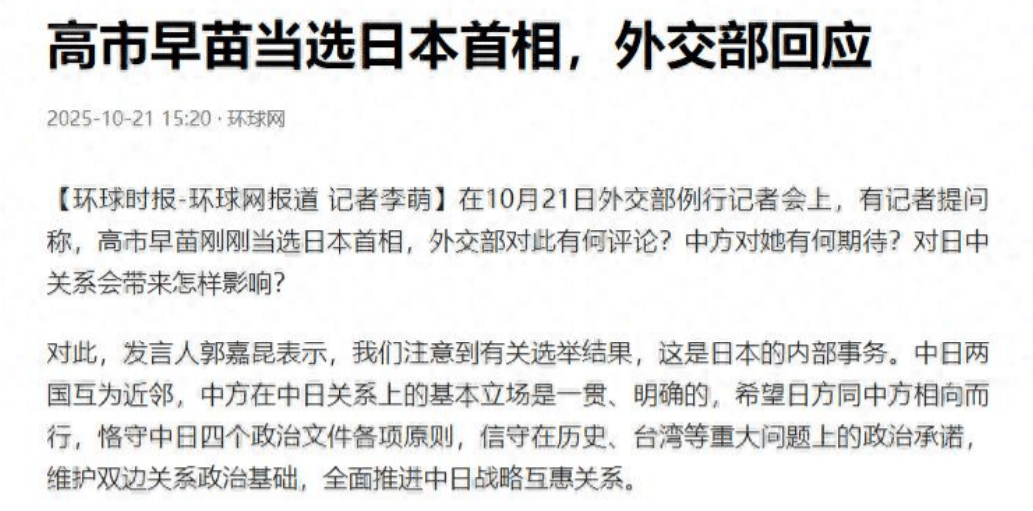 值得注意的是,中国这次回应中的一个细节变化,是特别提到了希望日本新内阁信守对历史和台湾等重大问题的承诺。这一表述与石破茂时期明显不同,后者的回应更多强调稳定与建设性,而高市则被视为更具有强硬色彩的右翼人士。这不仅意味着中方对高市政府可能采取强硬对华政策的警惕,同时也显示了中方在国际事务上的灵活应对策略。