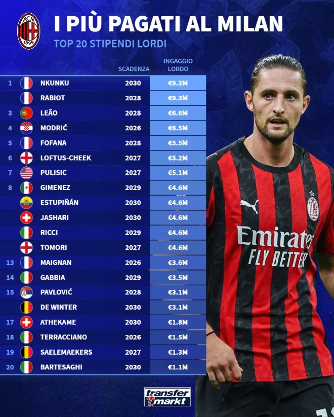 11月20日,德转列出了本赛季米兰球员的薪资排行,其中,两个法国人恩昆库和拉比奥以930万欧的年薪排在了榜首,19岁小将巴尔泰萨吉以110万欧排在末位。