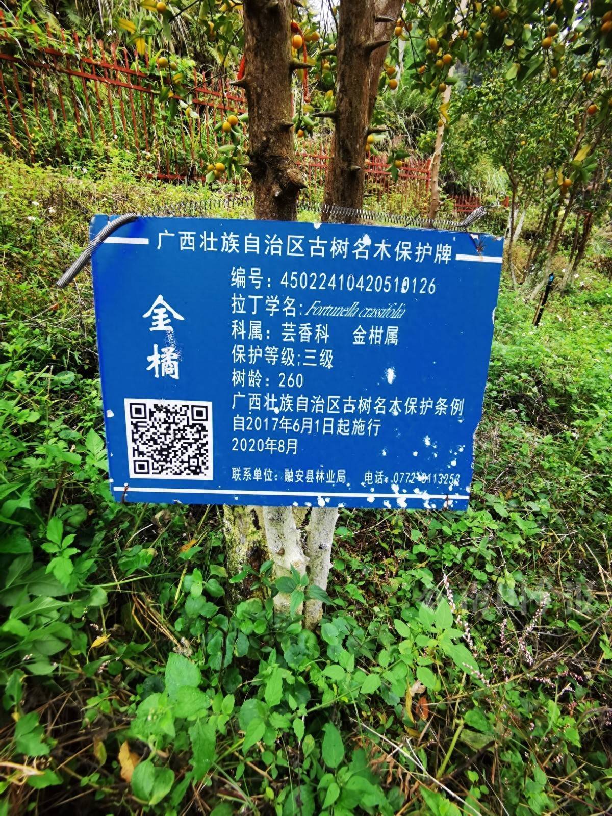 这片古树园被视作融安金桔的“始祖”,也是柳州市公认的“金桔树王”,当地群众亲切地叫它“金桔老家”。园内的19株金桔古树,是1758年由当地举人黄德坚从江西引进的实生油皮金桔。融安金桔产业正是依托这19株古树才得以不断发展壮大。