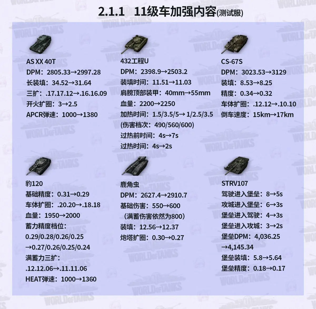 中坦方面,有432U、豹120、AS XX40t、CS-67S四台表现欠佳的11级车获得了加强。