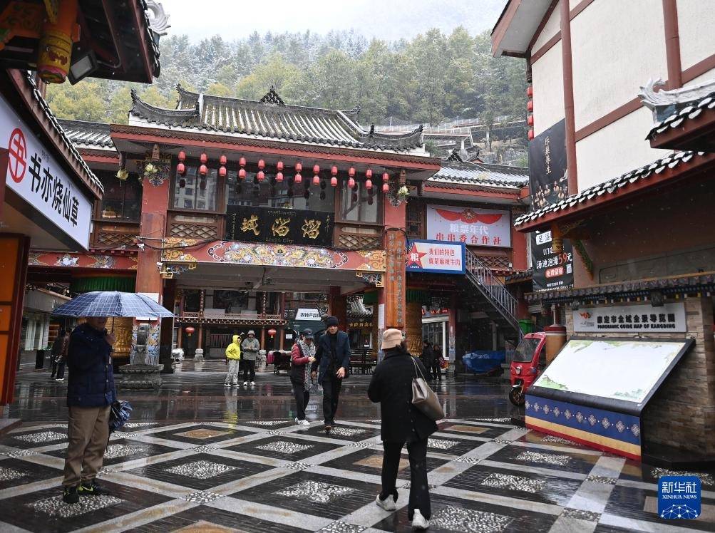 11月1日,游客冒雪在四川省甘孜州康定市溜溜城游览。