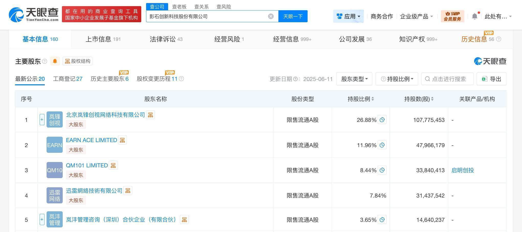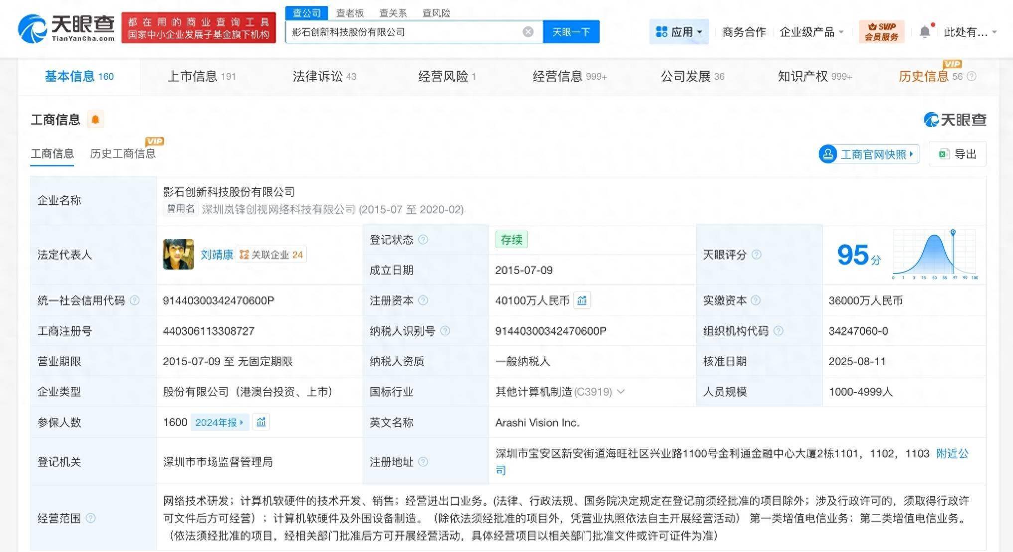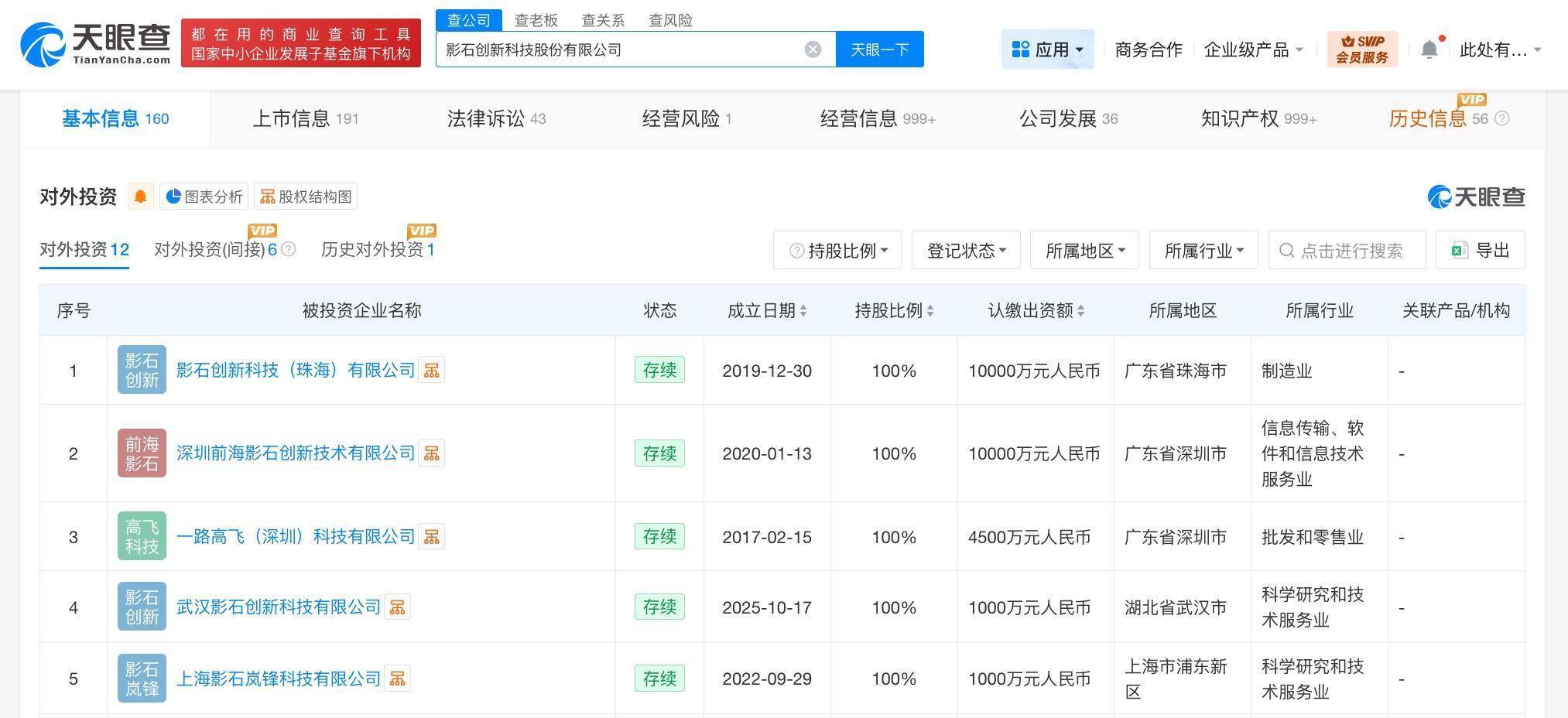 天眼查App显示,影石创新科技股份有限公司成立于2015年7月,法定代表人为刘靖康,注册资本4.01亿人民币,经营范围含网络技术研发,计算机软硬件的技术开发、销售,经营进出口业务,计算机软硬件及外围设备制造等。股东信息显示,该公司由北京岚锋创视网络科技有限公司、EARN ACE LIMITED、迅雷網絡技術有限公司等共同持股。对外投资信息显示,该公司直接持股10余家公司,包括影石创新科技(珠海)有限公司、深圳前海影石创新技术有限公司、一路高飞(深圳)科技有限公司等。